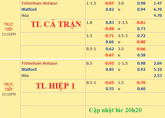 Tottenham vẫn giữ được kèo chấp 1 1/4 như thời điểm sáng nay nhưng thay vì điểm ăn cho 2 cửa cân bằng thì trước giờ bóng lăn chừng 40p, lợi nhuận cho cửa Tottenham đã bỏ rất sâu và dần đẩy tỷ lệ chính về mức 0:1. Mức tài xỉu dù vẫn là 3 hòa nhưng lợi nhuận cho cửa tài đã tăng từ 0.89 lên thành 0.98.