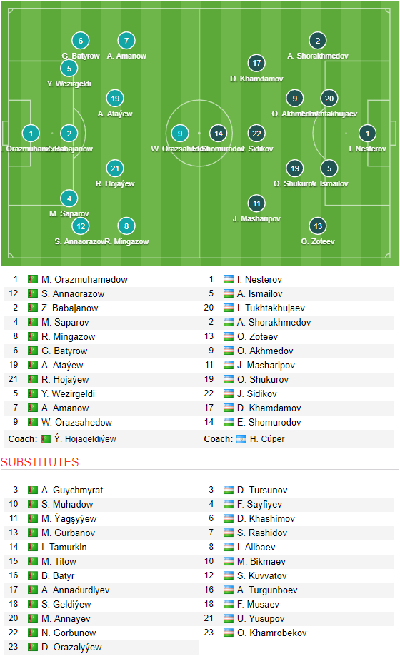 Turkmenistan (5-4-1): Orazmuhammedow - Annaorazow, Babajanow, Saparow, Ylýasow, Batyrow - Ataýew, Hojaýew, Mingazow, Amanow - Orazsähedow.