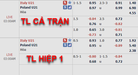 Trên sàn giao dịch châu Á, U21 Italia vẫn đang có tỷ lệ chấp 1 1/4 và mức điểm ăn không có sự thay đổi so với thời điểm chúng tôi cập nhật trưa qua. Ở bên phía tỷ lệ tổng bàn thắng cũng không có nhiều biến động, tỷ lệ 2 3/4 vẫn là tỷ lệ chính của trận đấu, mức điểm ăn bên phía cửa nhiều bàn thắng được nhà cái điều chỉnh giảm đôi chút.