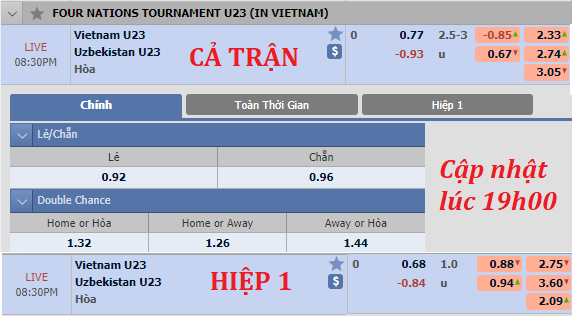 Trên sàn châu Á, nhà cái dành sự tôn trọng đáng kể cho U23 Việt Nam khi niêm yết kèo chính từ thời điểm cuối giờ chiều ở mức 0:0 và ngày càng hạ thấp lợi nhuận với lựa chọn chủ nhà. Dịch chuyển trên thị trường và đội hình không phải mạnh nhất của U23 Uzbekistan mang đến giải lần này cũng là yếu tố để tin tưởng vào đoàn quân dưới quyền HLV Park Hang-seo.