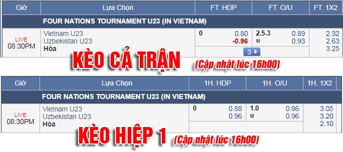 AEGoal.net chốt kèo trực tiếp trận U23 Việt Nam vs U23 Uzbekistan sau khi dựa trên tính toán, chuyển động về kèo châu Á và đội hình ra sân của 2 đội.