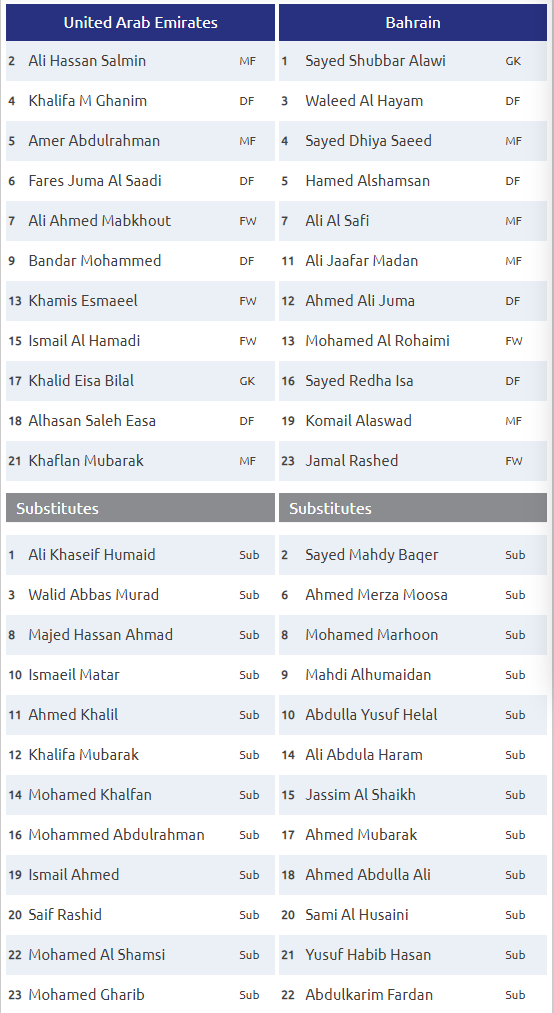 UAE: Khalid Eisa, Walid Abbas, Fares Juma Al Saadi, Ismail Ahmed Mohamed, Mohamed Ahmad Gharib, Ismail Al Hammadi, Majed Hassan, Amer Abdulrahman Abdulla, Mohamed Abdulrahman Alraqi, Ali Mabkhout, Ahmed Khalil
