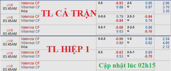 So với thời điểm trưa ngày 26/01, Valencia vẫn giữ được mức chấp hòa nhưng lợi nhuận cho cửa trên của họ thay vì ăn ít lại dịch chuyển thành mức bỏ (-0.93). Trong khi đó, mức tổng bàn thắng vẫn là 2 1/2 và xu hướng lựa chọn cửa tài nhiều hơn khiến điểm ăn cho cửa tài từ mức -0.99 thành 0.95. Như vậy, về cơ bản dịch chuyển về tỷ lệ là tín hiệu tích cực với Villarreal và cửa tài.