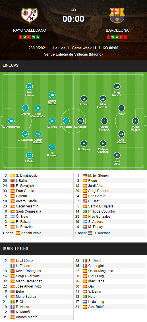 - Barcelona: Ter Stegen; Mingueza, Pique, Garcia, Alba; Roberto, Busquets, Gavi; Dest, Aguero, Depay