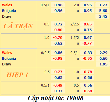 Cùng với đà mất điểm của đội cửa trên, kèo Tài-Xỉu cũng biến động theo chiều hướng tiêu cực. Tham số cởi mở 2 1/4 đã bị thay thế bằng kèo 2 hòa khi trận đấu chuẩn bị diễn ra. Như vậy, Wales ngày càng bị nghi nghi ngờ về khả năng giành chiến thắng, trong khi Bulgaria cũng thiếu chân sút đáng giá để hy vọng.