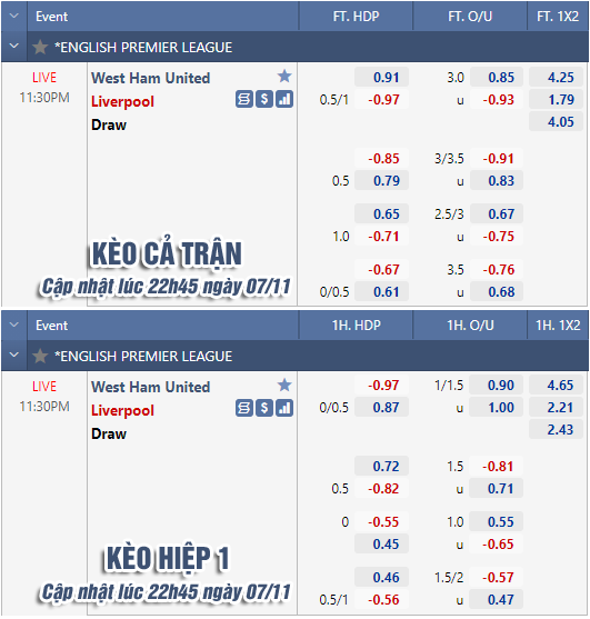 * Chốt kèo trận West Ham vs Liverpool (23h30 ngày 7/11)