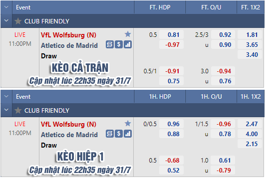 AEGoal chốt kèo bóng đá trực tiếp trận Wolfsburg vs Atletico Madrid diễn ra lúc 23h00 ngày 31/7 trong khuôn khổ giao hữu cấp CLB sau khi dựa trên tính toán, chuyển động về kèo châu Á và đội hình ra sân của 2 đội.