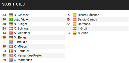 - Wolfsburg (4-2-3-1): Koen Casteels - Paulo Silva, Maxence Lacroix, John Brooks, Kevin Mbabu - Joshua Guilavogui, Xaver Schlager - Joao Victor, Felix Nmecha, Daniel Ginczek - Wout Weghorst