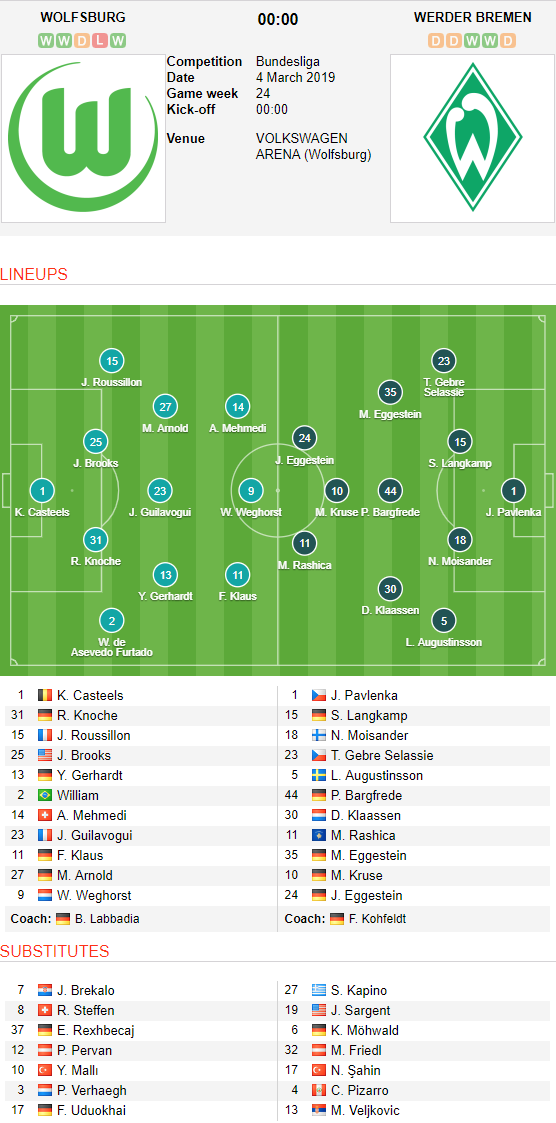 AEGoal.net chốt kèo trực tiếp trận Wolfsburg vs Bremen diễn ra lúc 00h00 ngày 04/03 sau khi dựa trên tính toán, chuyển động về kèo châu Á và đội hình ra sân của 2 đội.