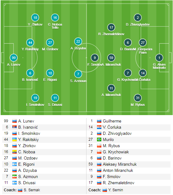 Trong đội hình ra sân của 2 đội, những cầu thủ tốt nhất ở thời điểm hiện tại đều đã được lựa chọn ra sân ngay từ đầu, tuy nhiên với những cái tên chất lượng hơn, Zenit đang tạo ra cảm giác đáng tin cậy hơn so với Lokomotiv Moscow. Bên cạnh đó, việc cả 2 đều ra sân với đội hình không quá thiên về tấn công cũng cho thấy khả năng tưng bừng bàn thắng của trận đấu là không nhiều.