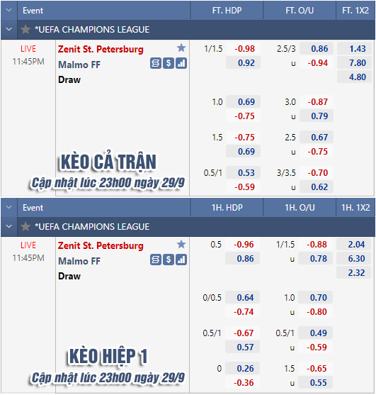 * Chốt kèo trận Zenit vs Malmo (23h45 ngày 29/09)