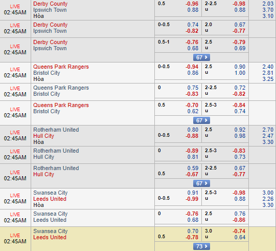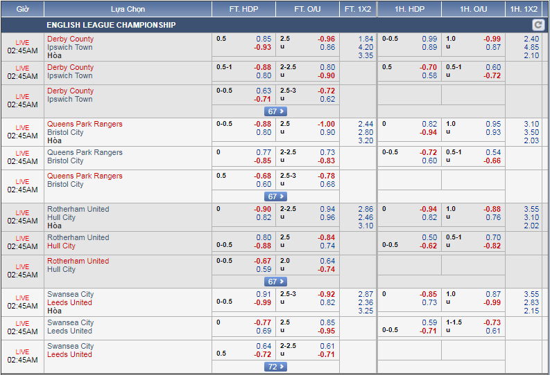 So với thời điểm đầu giờ chiều ngày 21/8, Derby County vẫn chấp hòa nhưng điểm ăn đã chênh lệch từ mức 0.85 thành -0.94. Rõ ràng, càng đến sát giờ bóng lăn thì Derby County càng mất giá. Đây là điều không bất ngờ bởi Derby County đang gặp "dớp" 10 trận liên tiếp không thắng Ipswich trên sân nhà.