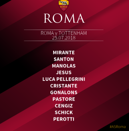 AS Roma (4-1-2-3): Mirante; Juan, Manolas, Kolarov, Karsdorp; Gonalons; Pastore, Cristante; Schick, Kluivert, Dzeko.