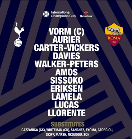 Tottenham (4-2-3-1): Vorm; Sanchez, Foyth, Aurier, Davies; Wanyama, Oakley-Boothe; Lamela, Son Heung-min, Lucas; Llorente.
