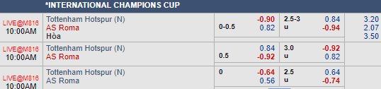Liên tục cập nhật và tư vấn kèo châu Á trận AS Roma vs Tottenham trong khuôn khổ ICC 2018.