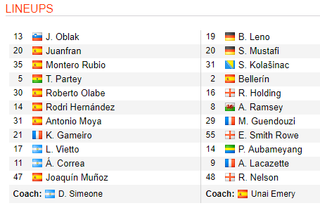 Atletico Madrid thiếu rất nhiều trụ cột ở trận cầu này do các ngôi sao như Griezmann, Godin, Jimenez hay Vrsaljko... đều được cho nghỉ ngơi sau World Cupp 2018. Bên phía Arsenal, họ tung vào sân đội hình rất mạnh bao gồm bộ đôi Aubameyang - Lacazette cùng với các trụ cột như Ramsey, Bellerin hay Mustafi.