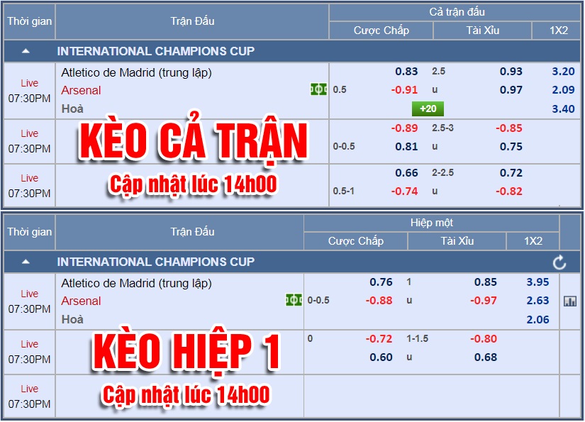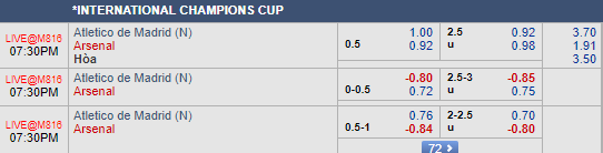 Liên tục cập nhật và tư vấn kèo châu Á trận Atletico Madrid vs Arsenal trong khuôn khổ ICC 2018.