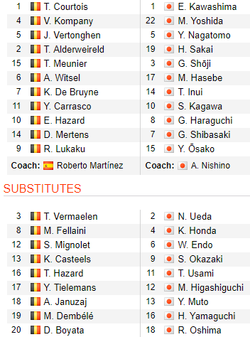 Đúng như dự đoán, Bỉ có sự trở lại của Lukaku, Eden Hazard, De Bruyne, Carrasco, Vertonghen, Alderweireld và Kompany trong đội hình xuất phát. Đội bóng châu Âu sử dụng lưc lượng tốt nhất của họ và tất nhiên hướng đến chiếc vé vào gặp Brazil tại tứ kết.