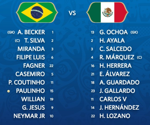 Không nằm ngoài dự đoán, Brazil tung vào sân đội hình mạnh nhất với bộ tứ Neymar-Jesus-Willian và Coutinho. Trong khi đó, Mexico cũng có đầy đủ các quân bài chủ chốt như Carlos Vela, Lozano, Javier Hernandez...