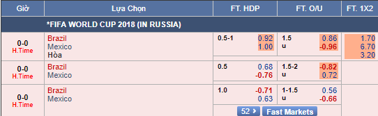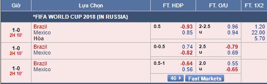 Brazil đã có bàn mở tỷ số và Mexico buộc phải dâng cao tấn công nhưng hàng thủ của Brazil vẫn chơi khá chắc chắn. Brazil cũng không cần chơi bung sức trong quãng thời gian còn lại. Với tỷ lệ tài xỉu như hiện tại thì nên tin vào cửa xỉu.