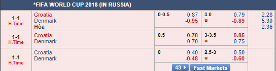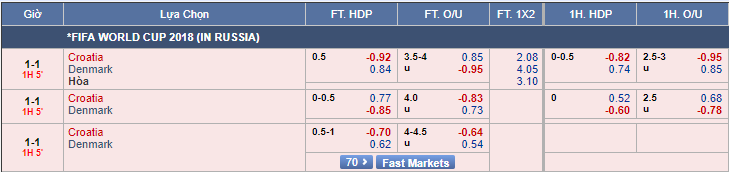 So với phiên khớp lệnh lúc 17h00 chiều ngày 1/7, tỷ lệ chính vẫn giữ ở mức Croatia chấp hòa nhưng điểm ăn cho cửa trên đã tăng từ mức 0.84 lên mức 1.00 trong khi ở mốc tài xỉu, định mức 2 hòa vẫn được giữ nguyên và điểm ăn cho cửa tài có giảm nhẹ.