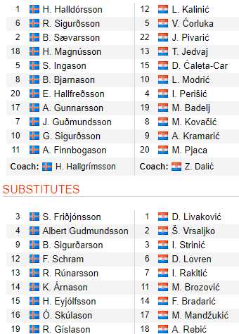 Croatia công khai luôn động thái giữ chân các trụ cột khi có rất nhiều sự thay đổi về nhân sự trong đội hình xuất phát. Cụ thể, HLV Dalic đã cất toàn bộ hàng thủ gồm thủ môn và 4 hậu vệ, ngoài ra phía trên một loạt trụ cột khác như Rakitic, Rebic, Mandzukic hay Brozovic đều ngồi trên băng ghế dự bị. Trong khi đó, Iceland vẫn xuất phát với đội hình mạnh nhất hiện có của họ.