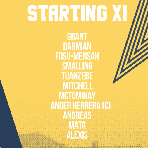 MU (3-5-2): Grant; Tuanzebe, Smalling, Bailly; Shaw, Darmian, Herrera, McTominay, Pereira; Mata, Sanchez.