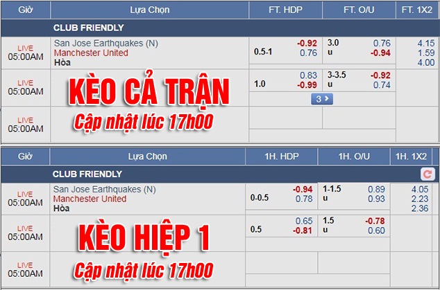 Trên các sàn giao dịch, tỷ lệ chấp 3/4 của MU hồi chiều đã được gia tăng chóng mặt. Hiện tại, sau khi hai đội đã công bố đội hình chính, MU đã được niêm yết chấp tới 1 1/2 trước San Jose. Nhìn chung, đó là sự dịch chuyển gần đủ đảm bảo cho một chiến thắng của cửa trên. Ngoài ra, các chuyên gia AEGoal cũng khuyên bạn có thể vào cửa Tài cả trận với mức kèo 3 1/4.