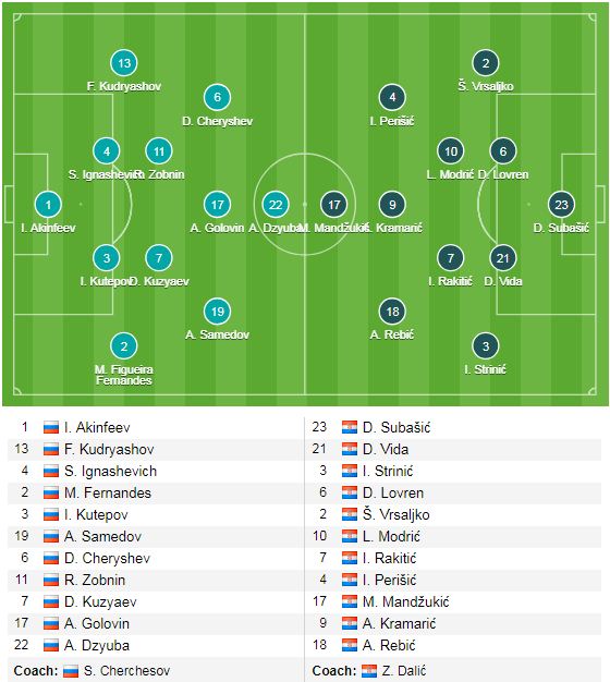Ở trận này, ĐT Nga có 1 số sự thay đổi trong đội hình ra sân so với trận gặp Tây Ban Nha khi lão tướng Zhirkov ngồi ngoài thay vào đó là Kudryashov trong hàng phòng ngự 4 người, ở tuyến trên là sự góp mặt của Cheryshev ngay từ đầu cùng Golovin, Samedov và Dzyuba tạo thành bộ tứ trên hàng công. Bên phía đối diện, Croatia chỉ có 1 sự thay đổi khi Kramarić ra sân ngay từ đầu thay cho Brozović. Việc cả 2 đều ra sân với đội hình với nhiều cầu thủ tấn công đang dẫn đến những hoài nghi về thế trận chặt chẽ ở cuộc đối đầu này, tuy nhiên nên nhớ rằng đây là vòng Tứ kết, và với những gì cả 2 đã thể hiện trước đó, sẽ khó có khả năng cởi mở từ cả 2 đội.