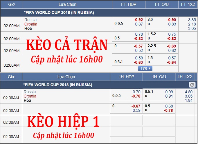 Ở 1 diễn biến khác, so với thời điểm cập nhật lúc 16h00, lúc này mức chấp của Croatia đã được đẩy từ -1/4 lên -1/2 cùng thang điểm ăn không quá chênh lệch, đây là tín hiệu không mấy khả quan cho những ai đặt niềm tin vào đội chủ nhà. Trong khi đó, mốc tổng bàn thắng cả trận vẫn được giữ nguyên ở mức 2 hòa, cùng với đó như phân tích ở trên việc cả 2 có những thay đổi trong đội hình đã dẫn đến những điều chỉnh có lợi cho khả năng bùng nổ bàn thắng khi tăng điểm ăn cửa Xỉu và giảm ở cửa Tài. Tuy nhiên có thể nhận thấy sự thay đổi này không mang tính đột biến, và thang điểm ăn giữa 2 đầu mã giao dịch vẫn đang khá cân bằng. Vì vậy, vẫn có thể tin tưởng vào khả năng nghèo nàn bàn thắng ở trận này.