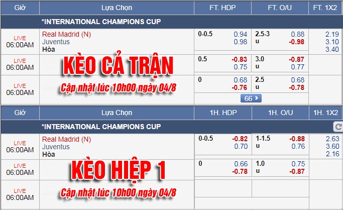 Liên tục cập nhật và tư vấn kèo châu Á trận Real Madrid vs Juventus trong khuôn khổ ICC 2018.