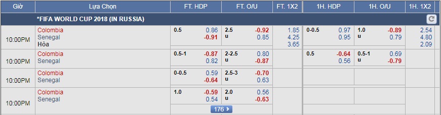 Colombia được đánh giá cao hơn Senegal với kèo chấp lên tới 3/4. Đó là kết quả của sự tăng tiến từ kèo 1/2 lên. Chứng tỏ giới đầu tư đang đứng về phía cửa trên nhiều hơn và các nhà cái buộc phải tăng kèo để kích thích người chơi vào cửa dưới để cân kèo.