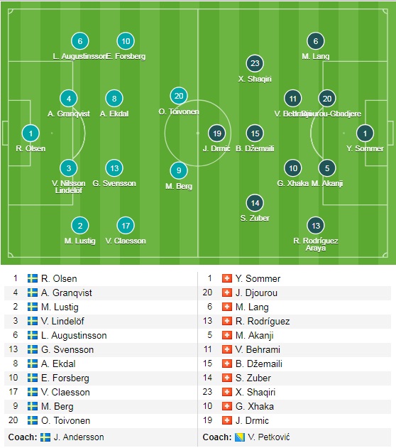 Thụy Sỹ (4-2-3-1): Sommer; J. Djourou, Elvedi, Akanji, Rodriguez; Behrami, Xhaka, Shaqiri, Dzemaili, Embolo; Gavranovic