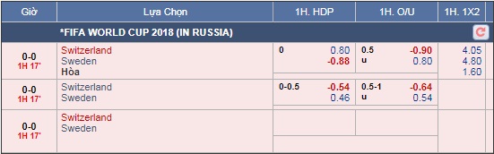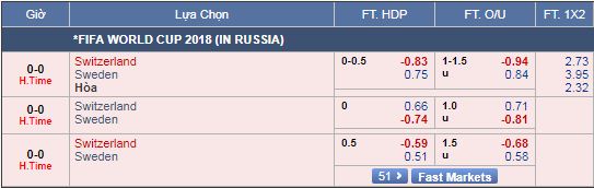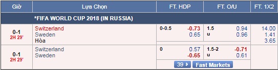 Không sở hữu quyền kiểm soát bóng nhiều hơn so với Thụy Sĩ, thế nhưng Thụy Điển mới là đội đang sở hữu nhiều cơ hội nguy hiểm hơn trong hiệp 1, chỉ tiếc là các chân sút của họ đang tỏ ra khá vô duyên. Trong khi đó, Thụy Sĩ đang thực sự bế tắc trước hàng thủ được tổ chức tốt của Thụy Điển, họ chủ yếu thực hiện những miếng đánh biên khá đơn giản và không gây khó khăn cho đối thủ. Ở 1 chiều hướng khác trong hiệp 2, Thụy Sĩ vẫn được đánh giá cao với mức chấp -1/4, tuy nhiên với thang điểm ăn tăng đến mức bỏ sâu, trong khi điểm ăn của mã Thụy Điển đang ở mức khá thấp cho thấy những hy vọng dành cho thầy trò HLV Andersson trong hiệp 2 là có cơ sở.