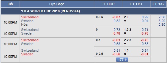 Ở 1 diễn biến khác, mức chấp của Thụy Sĩ đã được nâng lên thành -1/4, tuy nhiên điểm ăn cũng được nâng lên ở mức bỏ khá sâu trước giờ bóng lăn. Sự thay đổi này cũng không quá khó hiểu khi dù sao màn trình diễn của đại diện xứ đồng hồ ở vòng bảng là thuyết phục hơn. Trong khi đó, mốc tổng bàn thắng cả trận cũng đã được nâng từ 1 3/4 lên 2 hòa cùng thang điểm ăn khá cân bằng, dẫu vậy vẫn khó để hy vọng vào khả năng bùng nổ bàn thắng ở cuộc đối đầu này khi mà tính chất quan trọng của trận đấu không cho phép 2 đội chơi chủ quan.