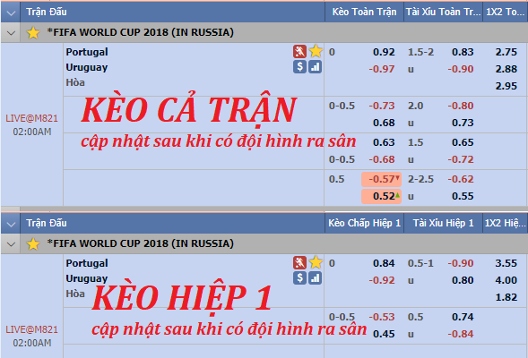 Không có nhiều đột biến đáng chú ý trong đội hình xuất phát của 2 đội khi Uruguay vẫn là bộ đôi tiền đạo chứ danh Luis Suarez và Edison Cavani, Bồ Đào Nha là ngôi sao sáng giá nhất Ronaldo cùng chân sút Guedes đá vị trí cao nhất. Tuy nhiên, diễn biến kèo châu Á lại có xu hướng nghiêng về nhà đương kim vô đich châu Âu nhiều hơn.