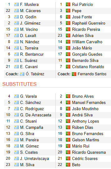 Bồ Đào Nha: Patricio, Pepe, Fonte, Cedric, Guerreiro, Quaresma, Moutinho, Carvalho, Mario, Bernardo Silva, Ronaldo.