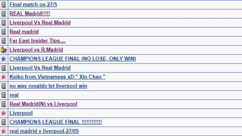 Vậy còn trên các diễn đàn bóng đá thì sao? Trên Forum Việt Nam tại Asianbookie có riêng một menu để thảo luận về trận chung kết Champions League. Trên các diễn đàn thì xu hướng lựa chọn lại đang bị chia đôi. Có rất nhiều người đặt niềm tin vào Real Madrid nhưng cũng không ít giới mộ điệu tin tưởng vào thầy trò Jurgen Klopp. Đa phần những người tin vào Real dựa vào lý do họ có kinh nghiệm tại Champions League còn những người tin vào Liverpool lại ưu ái về sức trẻ và sự nhiệt huyết.