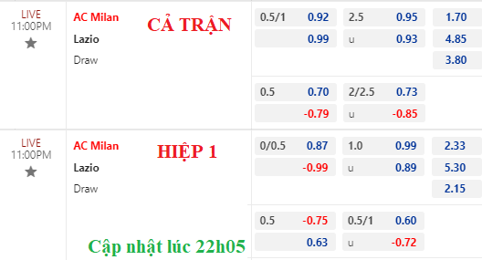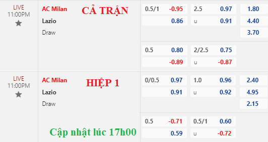 Tài xỉu vẫn là 2 1/2 cân tiền nhưng handicap AC chấp 3/4 ghi nhận điểm ăn cân bằng hơn, thay vì mức bỏ cho chủ. Trước đối thủ không hề yếu, việc AC Milan tăng giá nhẹ như vậy là tín hiệu tích cực dành cho Rossoneri.