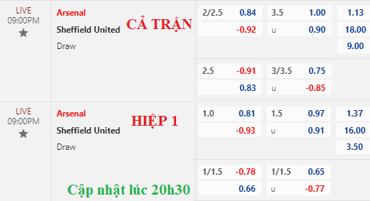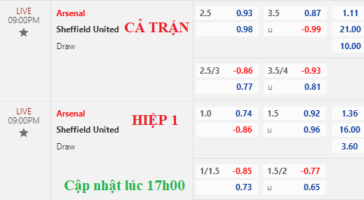 Kèo chấp 2 1/2 của chủ bị kéo về còn 2 1/4, trong khi tài xỉu 3 1/2 ghi nhận lợi nhuận ở cửa tài tăng đáng kể. Tỷ lệ giảm nhưng rõ ràng Sheffield United quá yếu để có thể cản bước Arsenal.