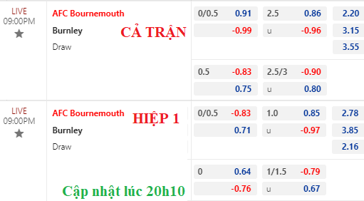 Tỷ lệ chính vẫn ở mức Bournemouth chấp đồng banh với lợi nhuận khá cân bằng giữa các lựa chọn. Trong khi đó thì tài xỉu 2 1/2 có điểm ăn thấp hơn ở lựa chọn tài. Với 1 trận cầu có sự tham gia của Burnley, cột mốc tài xỉu như vậy không phải là thấp. Đôi bên đều chơi phòng ngự lỏng lẻo thời gian qua, điều đó mang đến hy vọng về cửa tài.