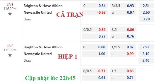Trên sàn châu Á, tỷ lệ vẫn là 0:0 và điểm ăn cho cửa Brighton xuống thấp hơn trong khi tài xỉu giữ nguyên. Dịch chuyển handicap như vậy mang đến sự tin tưởng vào chủ nhà.