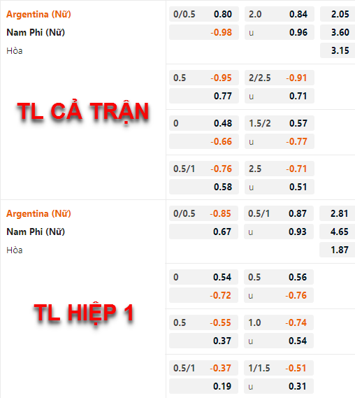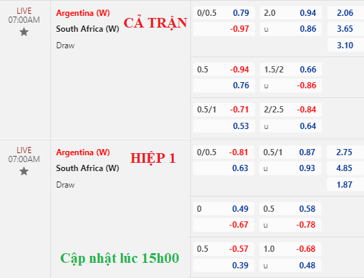Tỷ lệ của trận đấu không có nhiều thay đổi thời gian vừa qua, hiện tại Nữ Argentina duy trì mức chấp 1/4 và điểm ăn 2 cửa gần như không có biến động đáng kể. Bên phía tỷ lệ tài xỉu đã có những biến đổi rõ ràng hơn, mốc 2 hoà vẫn là mốc chính của trận đấu nhưng điểm ăn của cửa tài đã được điều chỉnh giảm tương đối nhiều so với lần chúng tôi cập nhật lần trước.