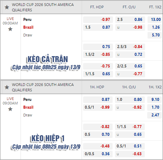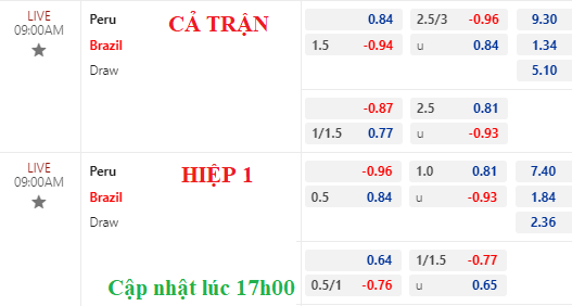* Chốt kèo trận Peru vs Brazil (09h00 ngày 13/09)