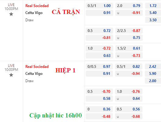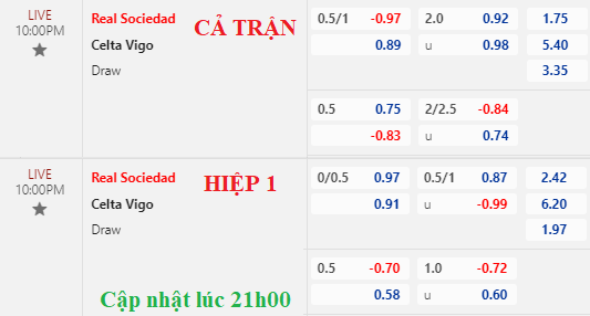 AEGoal chốt kèo bóng đá trực tiếp trận Sociedad vs Celta Vigo diễn ra lúc 22h00 ngày 19/08/2023 sau khi dựa trên tính toán, chuyển động về kèo châu Á.