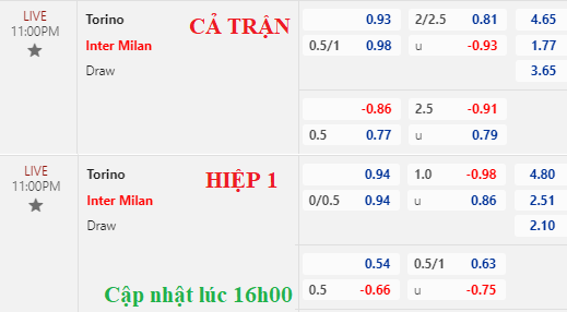 AEGoal chốt kèo bóng đá trực tiếp trận Torino vs Inter Milan diễn ra lúc 23h00 ngày 21/10 trong khuôn khổ giải VĐQG Italia sau khi dựa trên tính toán, chuyển động về kèo châu Á và đội hình ra sân của 2 đội.