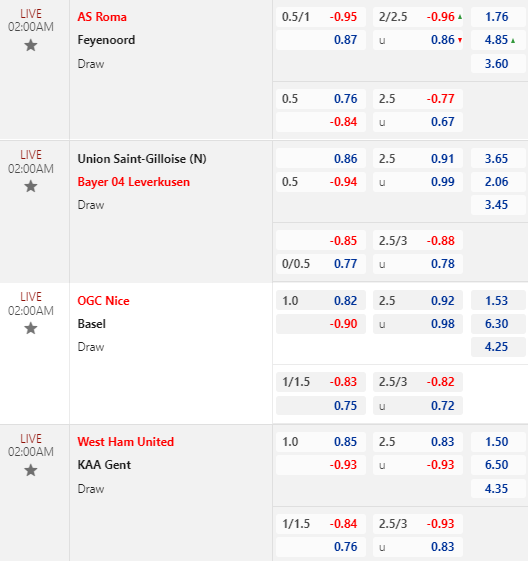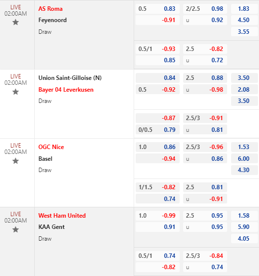 Tỷ lệ các trận Europa League và Europa Conference League cập nhật lúc 17h00: