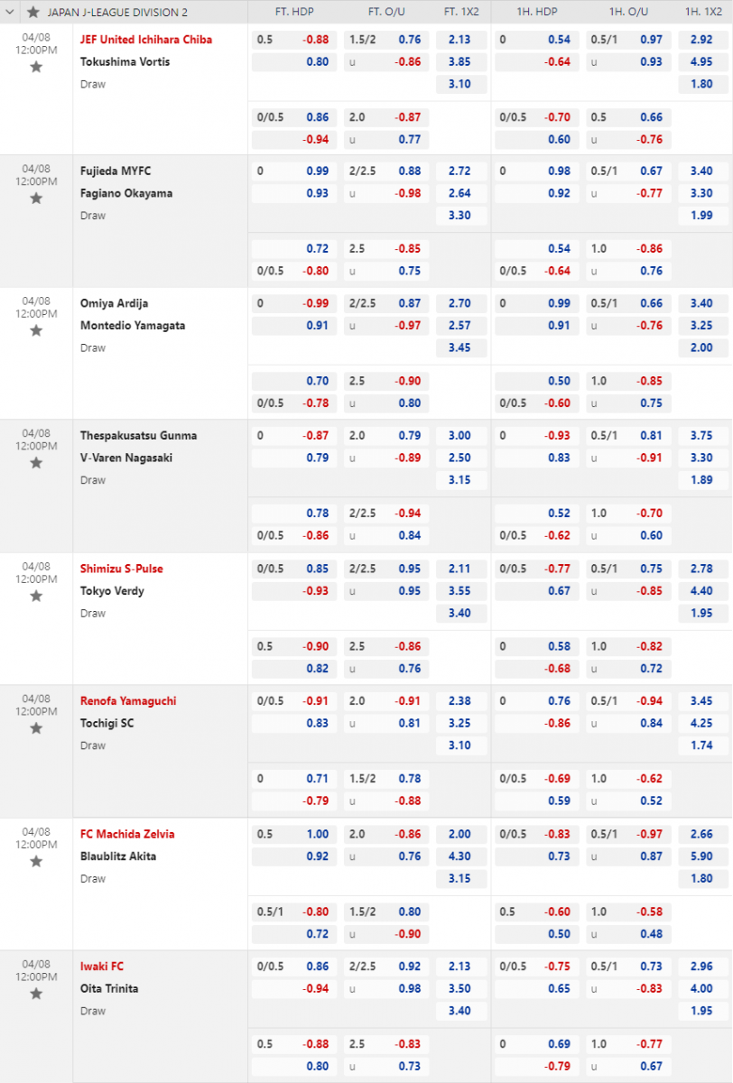 Tỷ lệ các trận đấu thuộc giải Nhật Bản và Hàn Quốc loạt 12h00 ngày 08/04/2023 (Cập nhật lúc 08h00)