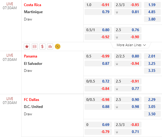 * Costa Rica vs Martinique: Cửa trên không có sức bật, hơn nửa kèo cả trận chấp 1 hòa mà hiệp 1 chấp có đồng banh là tỷ lệ rất "tối" với kẻ đi chấp. Costa Rica thời điểm này cũng không đáng tin cậy.