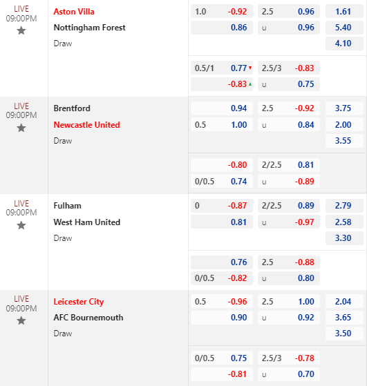 * Aston Villa vs Nottingham: Phong độ cao và được chơi trên sân nhà nhưng Aston Villa không có sức bật về tỷ lệ. Kèo chấp 1 hòa của họ vẫn bỏ sâu và đáng nói là tỷ lệ hiệp 1 Aston Villa chỉ chấp đồng banh càng cho thấy cửa trên không sáng giá.